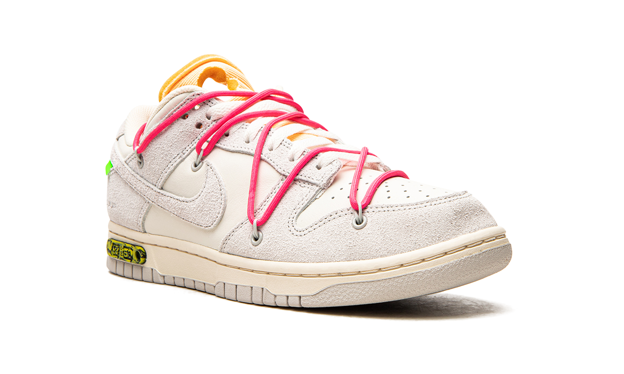 The Off-White x Nike Dunk Low “Lot 17” is one of multiple colorways of the classic low-top shoe created by Virgil Abloh in collaboration with Nike in August 2021. A monumental collection that spans 50 unique colorways of the retro basketball shoe, the Off-White and Nike “Lot 50” line succeeds Abloh’s influential “The 10” collaboration with Nike from 2017. On “Lot 17,” Sail canvas appears on the toe, mid-panel and collar. The overlays and Swoosh are constructed in Neutral Grey leather. Black “Nike” branding is printed on the heel and Off-White’s signature Helvetica text is found on the medial side. A secondary, bungee cord-like lacing system is added to the upper in addition to a traditional lacing setup. The look is carried over from Off-White’s first Nike Dunk collaboration from 2019. A marbled green-and-yellow insert with “Lot 17 of 50” appears on the midsole. Release date: August 9, 2021 Off White - Lot 17