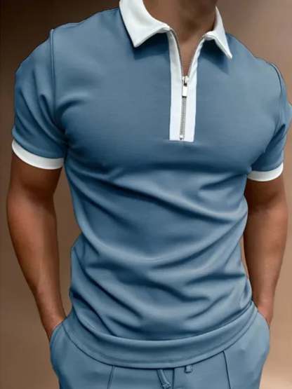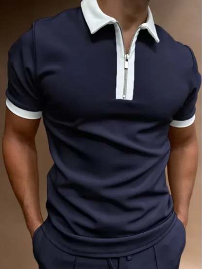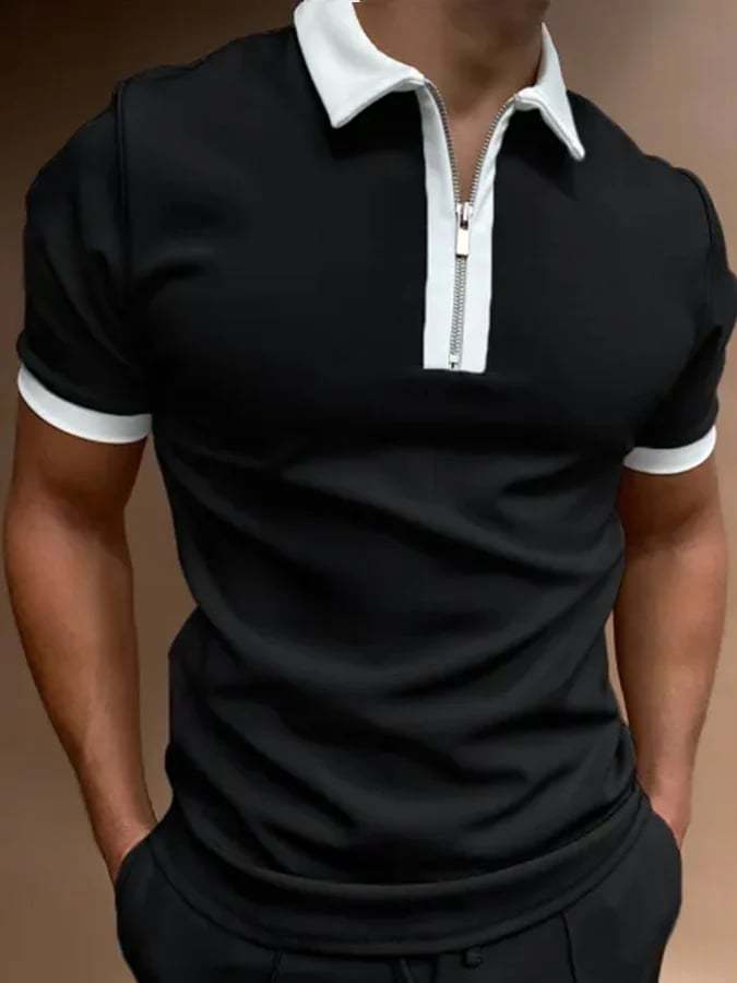 Men's Lapel Zipper Short Sleeve Color Matching Casual POLO Shirt